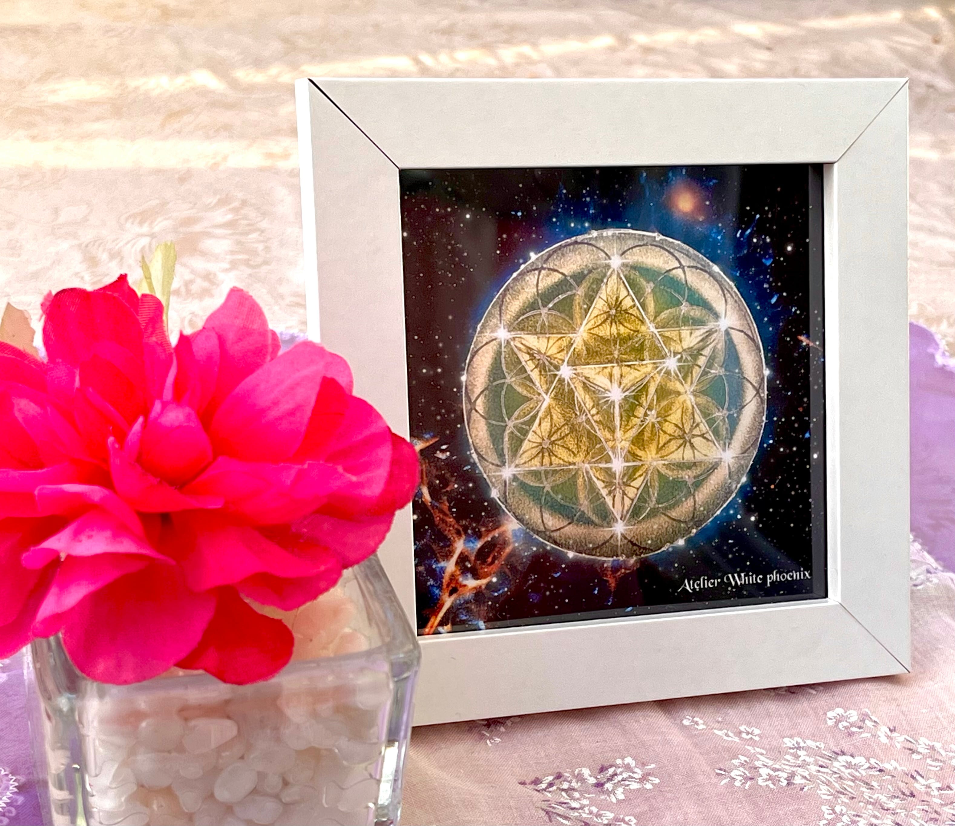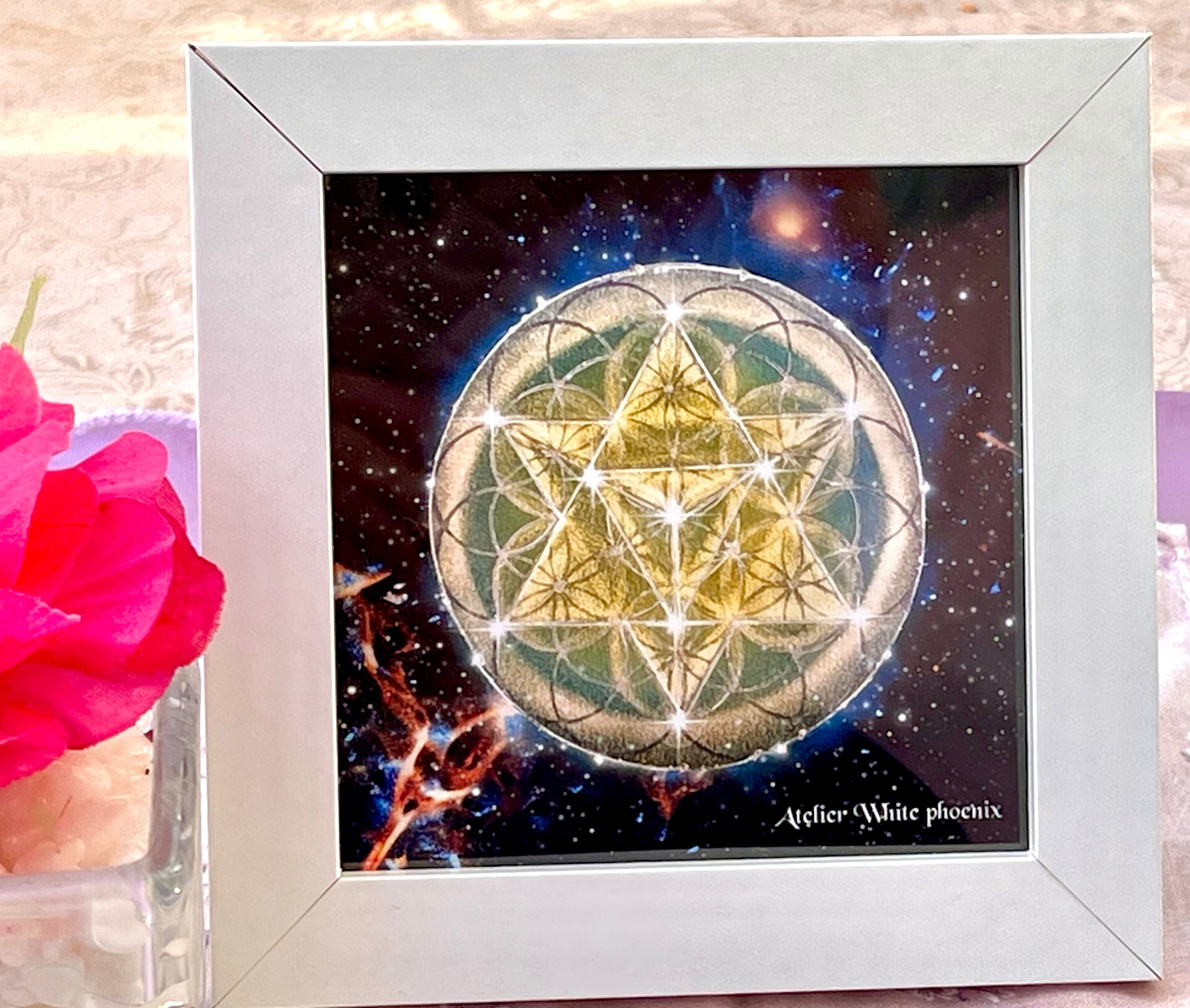 パステルアートで描いた神聖幾何学模様のマカバを、宇宙を背景にデジタル化し、ミニ曼荼羅にした作品