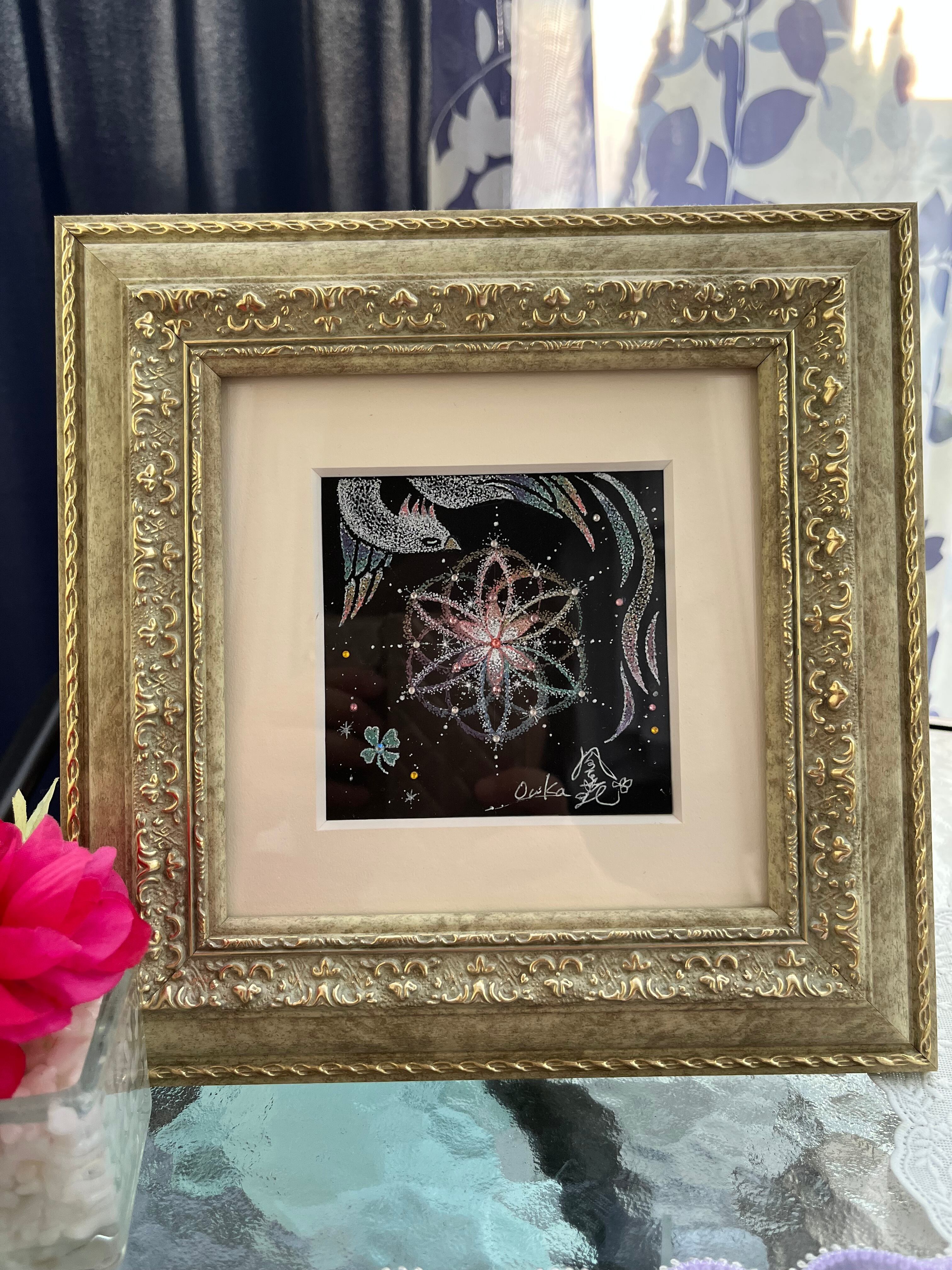 この作品は、細やかな点描によって表現されたシードオブライフの美しさが、鳳凰の神秘と融合したアートです。鮮やかな色彩と独特のデザインが、見る人の心を惹きつけ、内なる宇宙との繋がりを感じさせてくれます。
